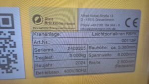 Wir freuen uns, Ihnen einen praktisch neuen Hallenkran zum Verkauf anzubieten, der Ihre zukünftigen Projekte erheblich erleichtern wird. Der Leichtportalkran RBPK 00113P von Ralf Brinkmann verfügt über eine Bauhöhe von ca. 5360 mm, eine Spannweite von 6000 mm und eine Breite von 2500 mm. Dieses Modell wurde im Jahr 2024 gebaut und ist bereit für den Einsatz. Profitieren Sie von der Qualität und Effizienz dieses Krans. Kontaktieren Sie uns bei Kilcher Transporte AG für weitere Informationen und um eine Besichtigung zu vereinbaren